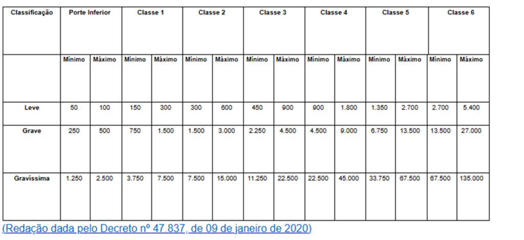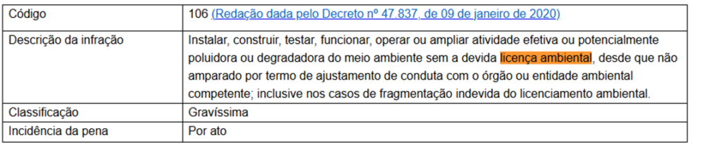 A seguir, está sendo apresentado duas tabelas retiradas do Decreto n° Nº 47.383, de 02 de março de 2018, apresentando como a legislação ambiental enquadra e penaliza empresas que operam sem Licença Ambiental Municipal.
